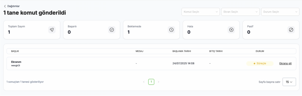 “Dağıtım Bekleniyor” butonuna tıklandığında, aşağıdaki ekranla karşılaşılır. Burada hangi güncellemeleri gerçekleştirmek istediğiniz ve buna bağlı ekran sayısı bilgisi yer almaktadır. “Dağıt” butonuna tıkladığınızda ekranlara gerekli güncellemeleri göndermiş olursunuz.